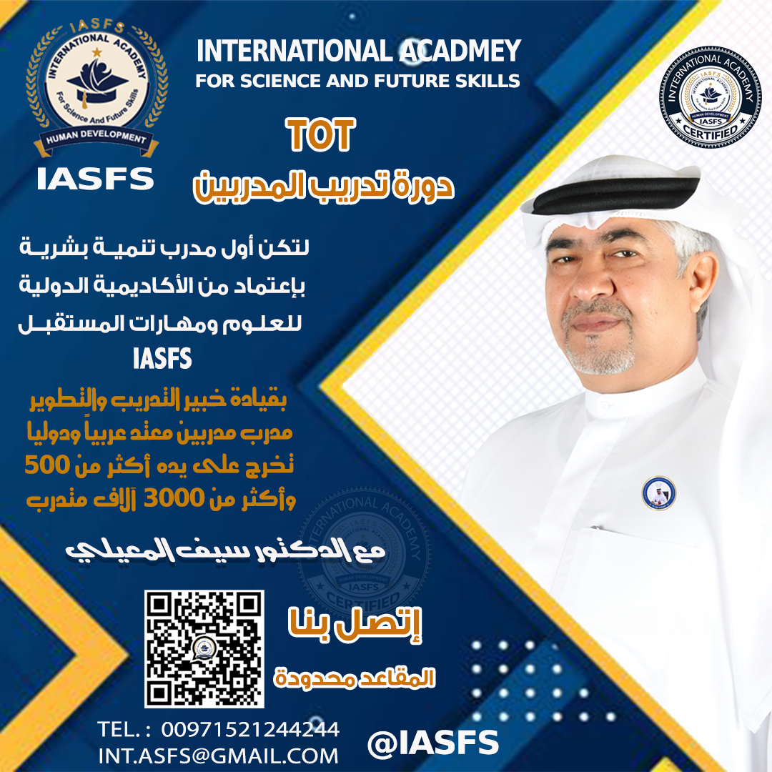To achieve a new future for your professional life and to acquire skills that make you stand out among your peers, whether you are an employee or a job seeker or you want to benefit from your accumulated experiences in your work and career, join the group of distinguished trainers during the TOT Training of Trainers course, which is organized with the accreditation of the International Academy for Science and Future Skills "IASFS" A professional course for training, preparing and qualifying human development trainers, from Monday 12 to 16 November 2024 .