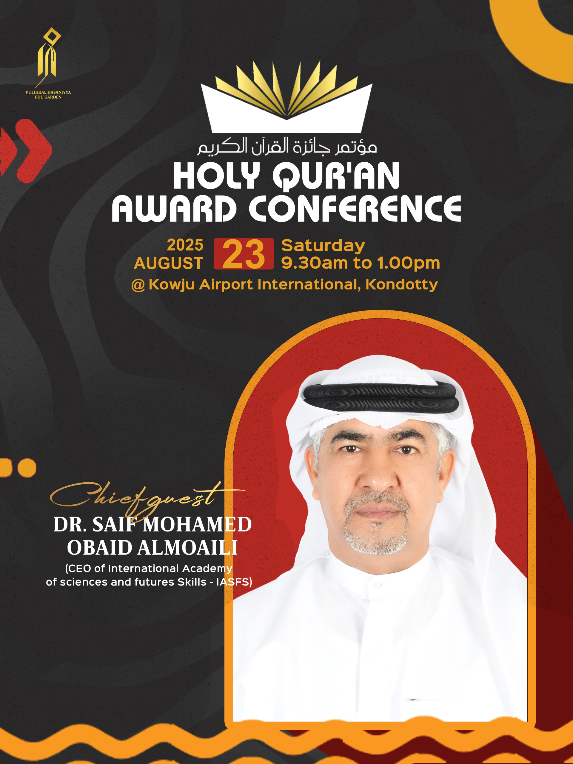 بدعوة كريمة من الأستاذ الفاضل حسن ثقفي الأزهري، شارك سعادة الدكتور سيف محمد عبيد المعيلي، الرئيس التنفيذي للأكاديمية الدولية للعلوم ومهارات المستقبل (IASFS)، في فعاليات المؤتمر الدولي لجائزة القرآن الكريم الذي أقيم في مدينة كيلاكوت بولاية كيرلا – الهند، يوم السبت الموافق 23 أغسطس 2025م.