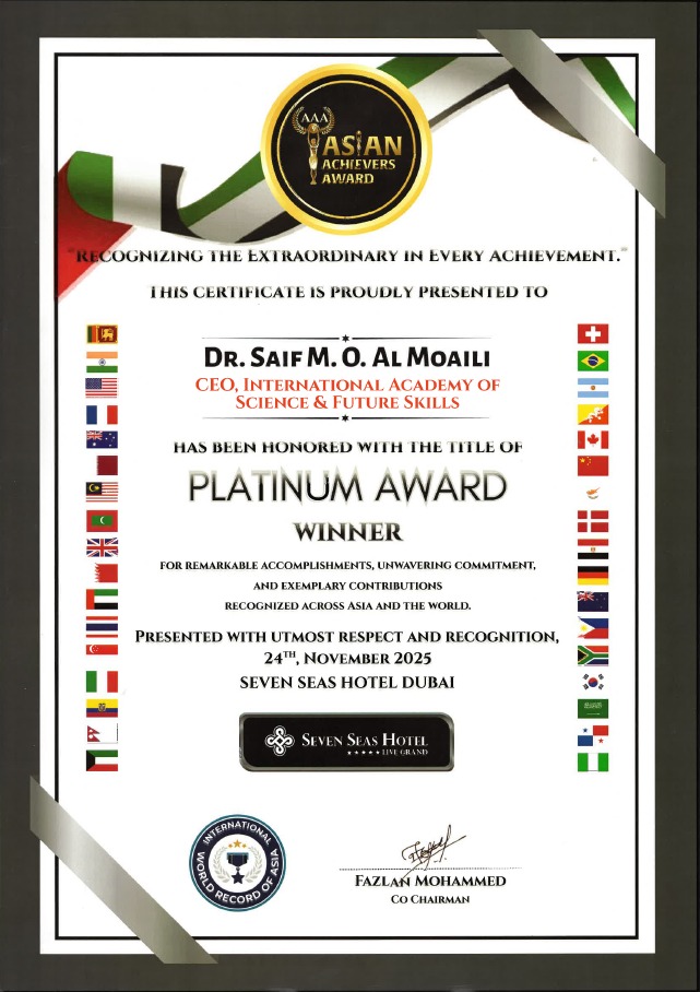 وقد جرى تقديم درع التميز للدكتور سيف المعيلي، والذي يحمل مجسم برج خليفة كرمز للطموح والامتداد العالمي، ويُعد هذا الحدث واحدًا من أبرز الفعاليات السنوية في آسيا، إذ تسعى جوائز المنجزين الآسيويين إلى الاحتفاء بقصص النجاح والإبداع التي تُسهم في بناء مستقبل أفضل للقارة، وتسليط الضوء على الشخصيات المؤثرة التي تشكل إضافة نوعية لمسيرة التقدم والتنمية. والنجاح الباهر، وموقّع من: فزلان محمد نائب الرئيس السجل العالمي الآسيوي.